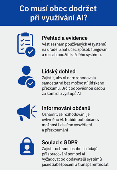 Obecní úřady mají podle nařízení rovněž povinnost informovat občany, pokud jejich žádost nebo jiná agenda je zpracovávána pomocí AI systému. Občan má mít možnost: