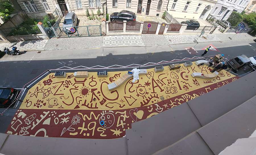 Výtvarný návrh proto pracuje s písmeny, číslicemi a kartografickými symboly. Na jejich podobě se podílely samy děti ze školy, které je v červnu 2025 také společně namalovaly na chodník před školou.