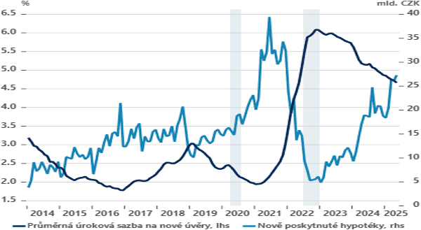 Růst tuzemských cen nemovitostí živí na jedné straně dlouhodobě zabrzděná výstavba, na straně druhé pak rostoucí příjmy domácnosti společně s poklesem úrokových sazeb. Ty však stále zůstávají na relativně vysokých úrovních, ale jejich restriktivní efekt zdá se v čase oslabil. Jen pro porovnání – v květnu letošního roku poskytly banky hypotéky v celkovém objemu 27,3 miliard Kč, blízko úrovním z euforického roku 2021, avšak při více než dvojnásobné výši hypotečních sazeb. Anekdotické evidence z trhu naznačují stále silnější efekt FOMO („fear of missing out“), tedy ochotu nakupovat za vyšší ceny z obav o ztrátu šance na vlastní bydlení.