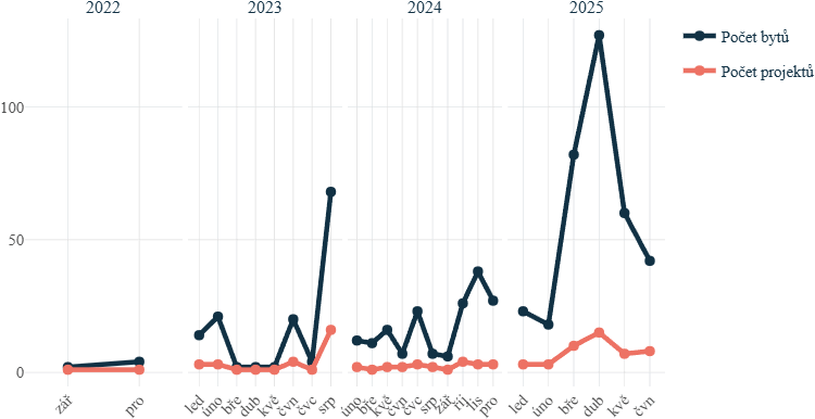 V jednotlivých letech počty podaných projektů v sociálním bydlení IROP kolísaly. K jejich významnému nárůstu došlo zejména na počátku roku 2025. Postupně se zvětšuje i velikost projektů. Za březen a duben 2025 IROP eviduje 25 nově podaných projektů s více než 200 sociálními byty.