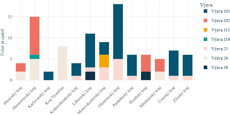 - V Olomouckém kraji je nejvíce projektů, a to zejména díky zájmu o novou výzvu pro méně rozvinuté regiony. Tam máme 13 projektů (Výzva 101). V prvním kole výzev jsme podpořili 5 projektů (Výzva 25).