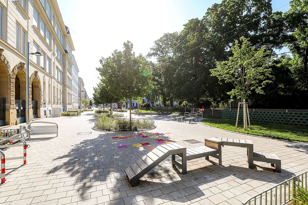 Modelovým příkladem úspěšné proměny okolí školy je Märzstraße v městském obvodu Penzing. Před pěti lety zde vznikla školní ulice a zóna bez automobilového provozu. V roce 2023 prošel prostor před školou zásadní přeměnou: asfalt nahradil propustný povrch, který umožňuje vsakování dešťové vody, přibyla zeleň a herní i vodní prvky. Výsledkem je atraktivní místo nejen pro děti, ale i dospělé.