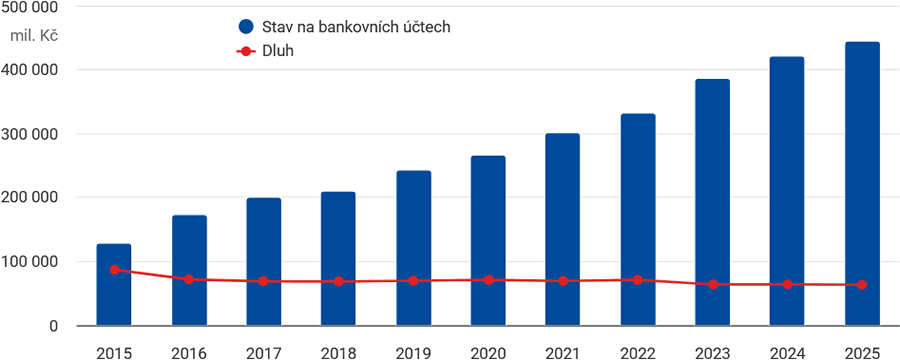 Nesporným faktem tak je, že stav úspor územních rozpočtů se neustále zvyšuje a oproti roku 2013 více než čtyřnásobně vzrostl, zatímco výše investic stagnuje nebo pouze mírně roste. Ke dni 30. 6. 2025 činil stav peněžních prostředků územních rozpočtů včetně zřízených příspěvkových organizací (PO) na bankovních účtech 560 mld. Kč. Dle propočtů ministerstva zůstatek na bankovních účtech dosáhne do 10 let částky 1 bilion Kč.