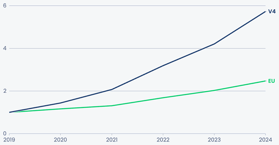 - Indexovaná základna nastavena na 1 pro rok 2019, aby se zobrazil relativní růst výroby solární energie. V4 zahrnuje Česko, Maďarsko, Polsko a Slovensko..