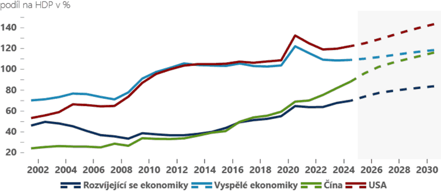 bude zejména dílo vyspělých ekonomik, které těží z toho, že mají historicky větší dluhopisové trhy, výraznější možnosti financování a ve finále i trpělivější investory ochotné „zkousnout“ i vyšší míry zadlužení. Vyspělé země mají již dnes úroveň zadlužení na 120 % HDP a v nejbližších pěti letech jim bez zásadních reforem má vzrůst zadlužení nad 130 % HDP. Rozvíjející se ekonomiky hlásí také rostoucí zadlužení, ale kvůli přísnější „kontrole“ trhů jsou s výjimkou Číny (jejíž veřejný dluh příští rok překoná 100 % HDP) úrovně dluhu výrazně nižší.