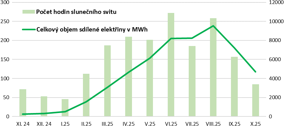 Vývoj objemu sdílené elektřiny v České republice kopíruje množství slunečního svitu v jednotlivých měsících. Vyplývá to z porovnání statistik Elektroenergetického datového centra (EDC) za první rok sdílení elektřiny a údajů Českého hydrometeorologického ústavu (ČHMÚ).