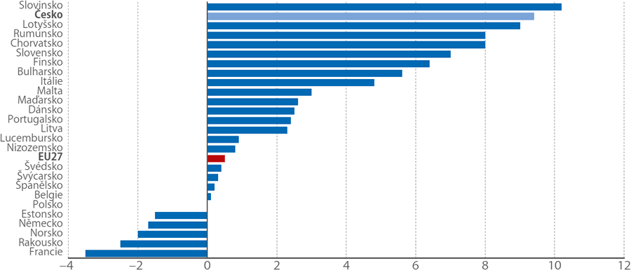 České stavebnictví se tak v průběhu roku 2025 stalo jedním z tahounů evropského stavebnictví, lépe na tom bylo pouze Slovinsko, kde stejně jako u nás rostly oba segmenty (viz graf). Průměr EU 27 srážela dolů zejména Francie, kde se odehrál pokles napříč segmenty. Snížení stavební produkce vykázaly ještě naše sousední státy Polsko, Rakousko a Německo.