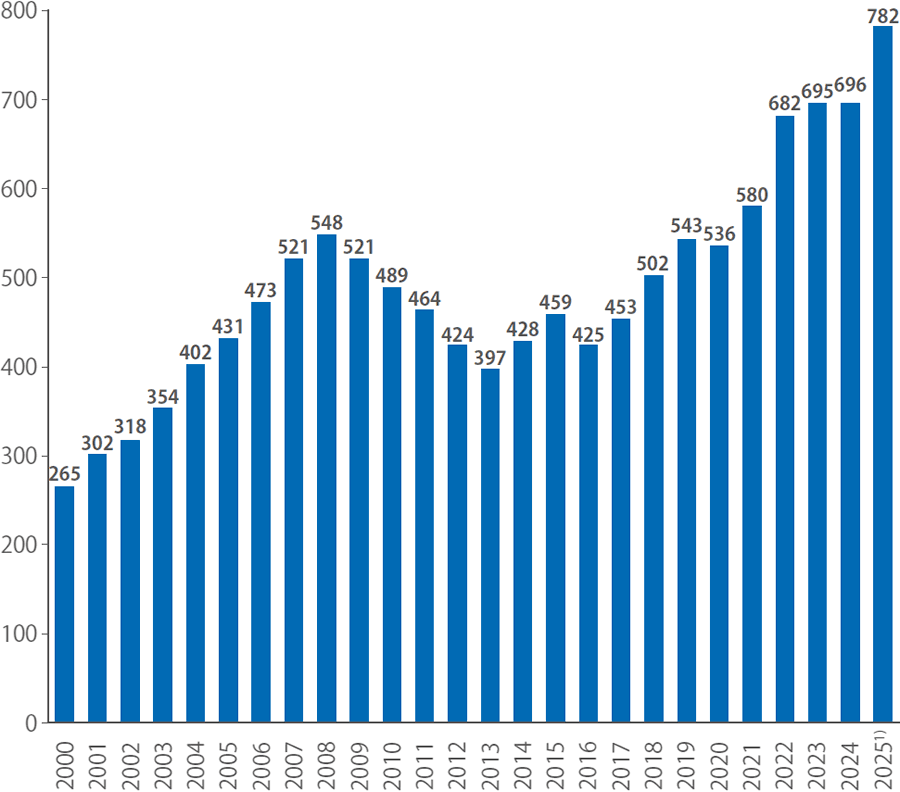 Zatímco index stavební produkce vyjadřuje dynamiku odvětví, pro náhled do jeho struktury slouží ukazatel stavební práce S vyjádřený v korunách. Za rok 2025 zatím není k dispozici roční výkaz. Předběžně se uvažuje na objem v běžných cenách, který by mohl dosáhnout zhruba 780 mld. Kč (viz graf).