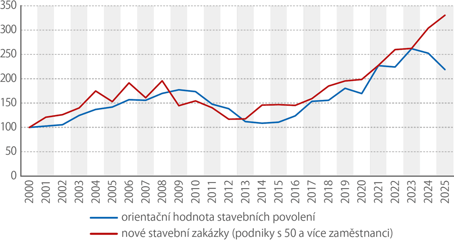 Dalším předstihovým ukazatelem je orientační hodnota vydaných stavebních povolení, která loni dosáhla 503,3 mld. Kč a meziročně klesla o 13,3 % (v běžných cenách) zejména vinou nové výstavby inženýrských staveb a nebytových budov. V roce 2025 bylo povoleno 51 staveb s rozpočty nad 1 mld. Kč, to však celkovému poklesu předpokládané hodnoty staveb nezabránilo. Vyšší investice se plánují ve Středočeském kraji, v Praze a v Jihomoravském kraji.