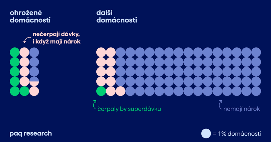 Čerpání nepojistných dávek je dlouhodobě nízké. Příspěvek na bydlení na konci roku 2025 čerpalo 25 % oprávněných domácností a přídavek na dítě 32 % oprávněných domácností. Alespoň jednu ze čtyř dávek slučovaných do superdávky čerpalo jen zhruba 30 % domácností s nárokem na superdávku (první pruh v grafu).
