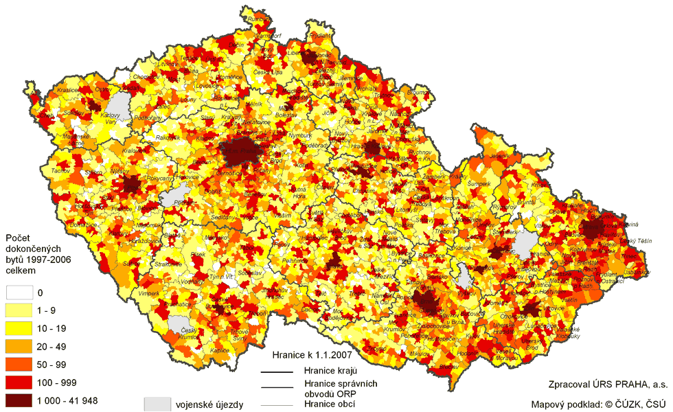 Nerovnoměrnost bytové výstavby v České republice ilustruje kartogram Dokončené byty celkem 1997--2006 podle obcí. V intervalu s největším počtem dokončených bytů je zastoupeno hlavní město Praha s 41 948 dokončenými byty, Brno s 10 941 byty a Plzeň s 3147 byty.