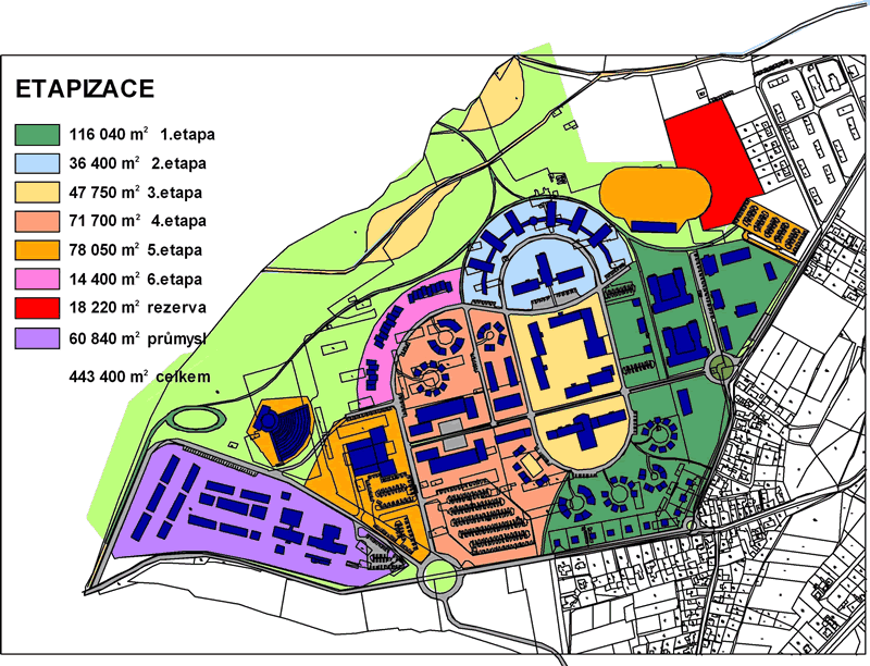 Bylo nutné rovněž ponechat průmyslové plochy se samostatným dopravním napojením, které umožní nezávislý rozvoj a obsluhu na zbývajícím areálu a umožnit urbanistickou strukturou návrhu ekologické formy výstavby s minimálními přesuny hmot a využitím místní materiálové základny.