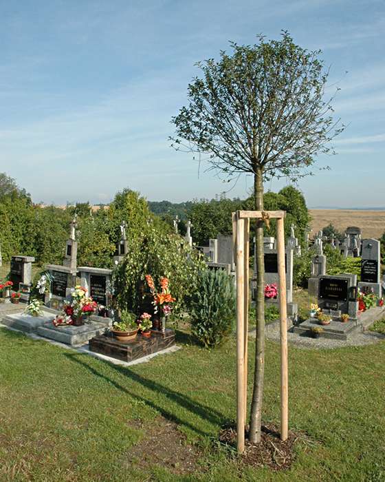 Podél dvou hlavních hřbitovních cest, které se protínají u centrálního kříže, rostly staré túje. Tyto nemocné okrasné dřeviny byly vykáceny a jejich pařezy odfrézovány. Následně bylo vysázeno 21 nových okrasných stromků a vyset travní porost.