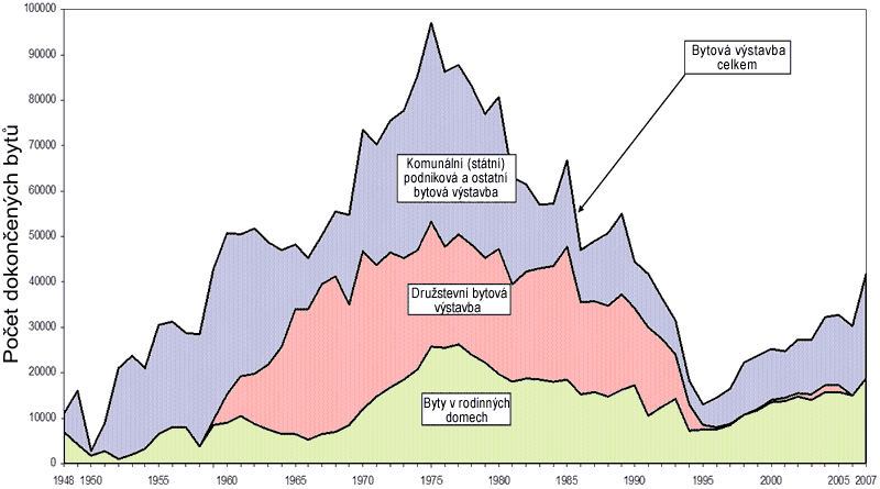 Pro charakterizování kvantitativních rámců těchto procesů je uveden graf 1, ukazující rozsah bytové výstavby v letech 1948--2007 a tab. 1 s uvedením počtu dokončených bytů (absolutně a na 1000 obyvatel) ve vybraných letech