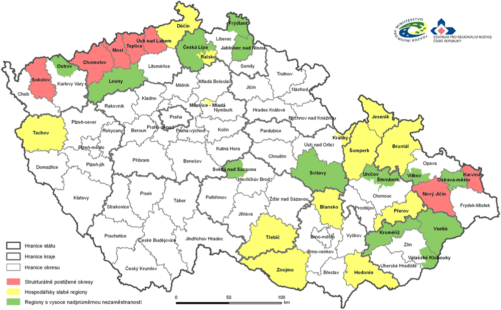 Z celkového pořadí získaného propočtem bylo vybráno 17 nejvíce problémových okresů. Jako strukturálně postižené regiony pak byly vymezeny okresy s vyšším podílem těžebního a těžkého průmyslu (Teplice, Most, Chomutov, Ústí nad Labem, Sokolov, Karviná a Nový Jičín) a ostatní okresy podle pořadí problémovosti byly klasifikovány jako hospodářsky slabé. Tyto okresy byly obdobně jako ve Strategii regionálního rozvoje ČR doplněny těmi okresy a obvody ORP, které od 30. 9. 2008 v průměru překračují o více než 25 procent republikovou míru nezaměstnanosti.