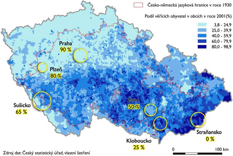 Religiózní charakter území dokumentuje i umístění hrobů. V silně religiózních oblastech jako je Straňansko, jsou hroby orientovány výhradně ve směru východ-západ (obrázek 6), což odpovídá křesťanskému učení. V jiných oblastech Česka lze nalézt hroby orientované různým směrem. Hřbitovy v tradičně religiózních oblastech se dále vyznačují vysokým podílem rodinných hrobů, velkou upraveností hrobů a vysokým počtem náhrobních religiózních symbolů. Charakteristický je obzvláště vysoký počet náboženských symbolů na nových hrobech.
