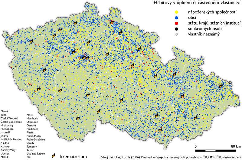 Z celkového počtu 5518 pohřebišť v současnosti (viz obrázek 3) vlastní církve a náboženské společnosti přibližně 1/3 hřbitovů (či částí hřbitovů). Vlastníky hřbitovů lze rozdělit do 4 kategorií: