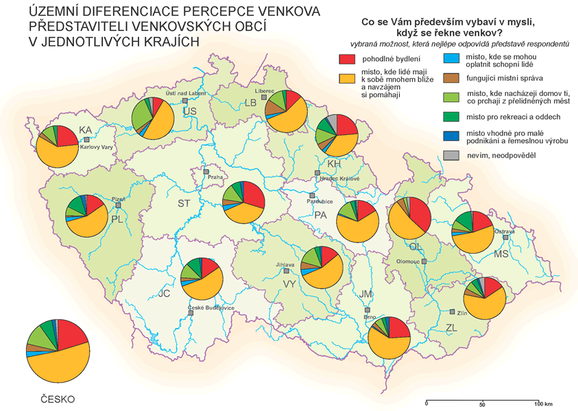 Pokud je venkov region, měl by být v souladu s výše uvedenými skutečnostmi rozpoznatelný navenek i pro své obyvatele, měl by mít svoji komunitu a své atributy. Co se lidem vybaví, když se řekne venkov? Tuto otázku jsme mimo jiné položili v rámci dotazníkového šetření mezi zastupiteli 1074 venkovských obcí Česka a její výsledky ukazuje kartodiagram (mapa). Polovina respondentů vybrala z nabízených odpovědí tu, že venkov je "místo, kde lidé mají k sobě mnohem blíže a navzájem si pomáhají". To potvrzuje obecnou zkušenost, že sociální vztahy na venkově jsou postaveny na jiné bázi než více anonymní prostředí měst, kde se většina lidí osobně nezná. Intenzivní sociální kontrola na venkově tak bývá místními obyvateli oceňována spíše kladně. Představuje sice určitý zásah do soukromí, ale přináší prevenci sociálně patologických jevů (kriminalita, vandalismus, alkoholismus), pocit bezpečí a výpomoc.