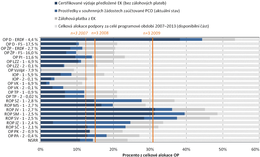 Rok 2011 je z hlediska čerpání finančních prostředků v tomto programovém období klíčový. Poprvé jsme konfrontováni s plněním pravidla n+3 (což obecně znamená, že závazek vůči EK musí být splněn do tří let od svého vzniku). "Ministerstvo jako národní koordinátor věnuje této otázce maximální pozornost. Sledování, jak si jednotlivé programy vedou, probíhá ve dvou úrovních. Pravidelně vyhodnocujeme finanční (a nově i věcné) plnění programů, každý měsíc uveřejňujeme Měsíční monitorovací zprávy na webu www.strukturalni-fondy.cz. Dále pak byl pro operační programy, které byly identifikované jako rizikové, zaveden tzv. systém zesíleného řízení rizik", říká ministr pro místní rozvoj Kamil Jankovský. "Už nyní můžeme říci, že u všech programů se tento systém osvědčil a byl zaznamenán pokrok", dodává Jankovský.
