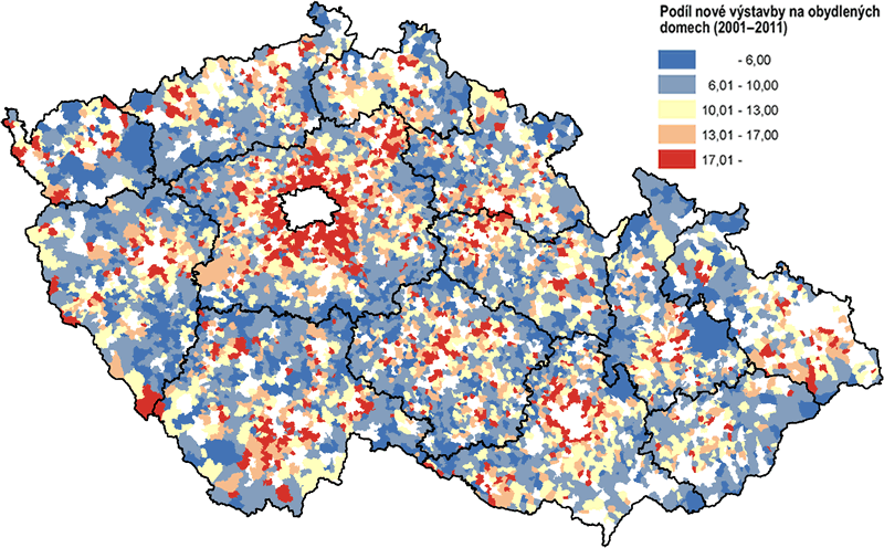 Z regionálního pohledu početně získávaly zejména obce v zázemí metropole, ale rovněž v blízkosti dalších velkých (převážně krajských) měst. Pod republikovým průměrem (3,2 %) jsou zejména obce při krajských hranicích a v oblastech s vyšší nadmořskou výškou (Šumava, Jeseníky), kde docházelo během posledního desetiletí k úbytku obyvatel. Právě tyto obce mají do budoucna znevýhodněnou pozici, neboť je zde mnoho neobydlených domů, obyvatelstvo spíše odchází nebo vymírá, bytová výstavba stagnuje a vzdělanostní charakteristiky obyvatelstva jsou na nižší úrovni. Tyto rysy perifernosti jsou do velké míry zapříčiněny nevýhodnou polohou vzhledem k centru vyšší územně-správní jednotky, v tomto případě kraje (Novotná 2005).