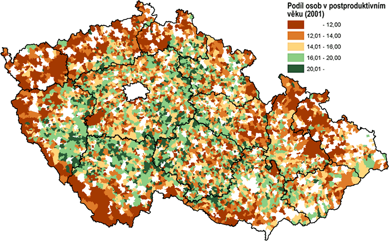 Nepříznivá věková struktura obyvatelstva se spíše než podle velikostních kategorií venkovských obcí projevuje regionálně. Z obr. 5 a 6 je patrná mladší věková struktura obyvatelstva příhraničních dosídlených oblastí, Jeseníků, Znojemska a díky intenzivnější suburbanizaci v posledním desetiletí také v zázemí hl. města Prahy.