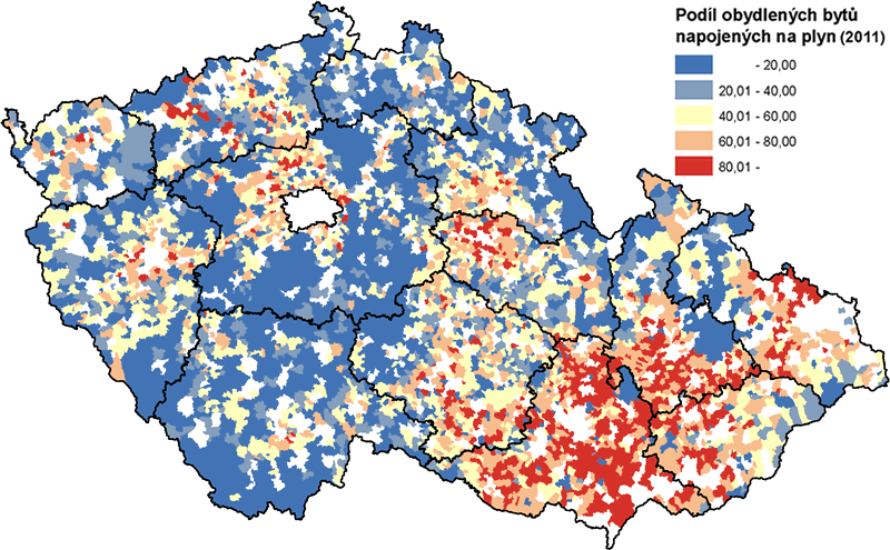 Od 90. let bylo Státním fondem životního prostředí podporováno rozšíření plynofikace a elektrických přímotopů. Cílem bylo snížit vysoké emise v ovzduší zejména v severozápadních Čechách a dalších regionech. Do roku 2004 tak byla velká část největších obcí (prakticky všechny obce nad 5000 obyvatel a většina obcí od 2000 do 5000 obyvatel) plynofikována. Pak však začal plyn zdražovat a zájem domácností o zřízení přípojky poklesl. Plynofikovány nejsou v současnosti především menší obce. Z regionálního pohledu je charakteristická vyšší míra plynofikace v moravské části republiky, kde jsou venkovské obce velké (viz obr. 7).