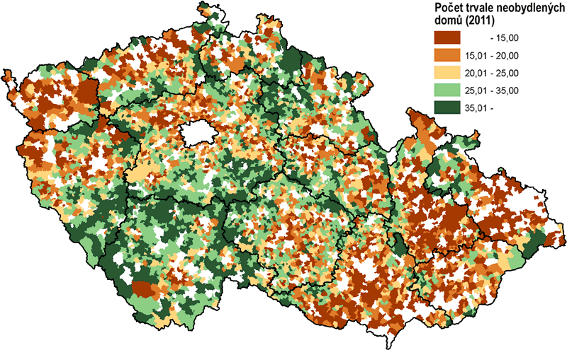 Kromě suburbánních oblastí jsou z výsledků sčítání znatelné i jiné územně specifické oblasti (Perlín, Kučerová, Kučera 2010), které přetrvávají již několik desetiletí. Postupně se však tyto rozdílnosti stírají. V případě obcí při vnitřních hranicích administrativních celků, v tzv. vnitřních perifériích (Musil, Müller 2008), se spíše prohlubují. Tyto oblasti v současnosti slouží často k rekreačním účelům, o čemž svědčí i velmi vysoký podíl neobydlených domů (viz obr. 8).
