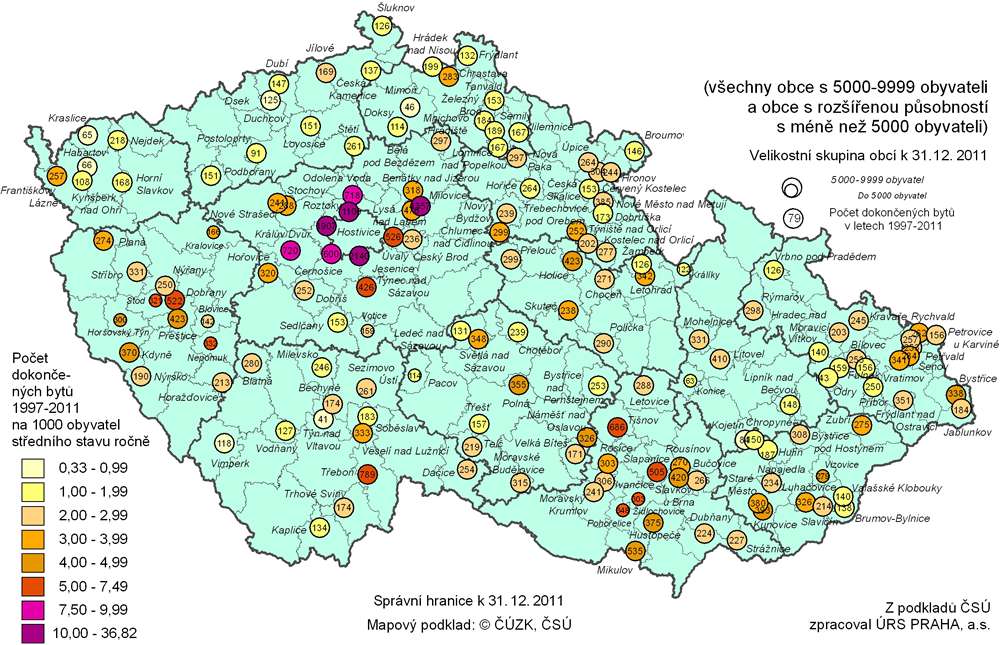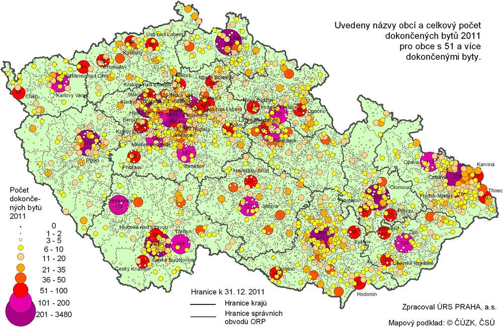 Na území České republiky existovalo k 31. 12. 2011 celkem 6251 obcí (včetně 5 vojenských újezdů). Z tohoto počtu se v období 1997–2011 podle údajů ČSÚ nepostavil ani jeden byt ve 240 obcích (3,2 % z úhrnu obcí), tedy alespoň jeden byt se postavil v 6011 obcích, tedy v 96,2 % celostátního úhrnu. Více než 20 bytů bylo postaveno v 2569 obcích, které tvoří více než dvě pětiny (41,1 %) počtu všech obcí. Z hlediska změn v čase lze uvést, že rozmístění počtu dokončených bytů na území státu je stále plošnější (obr. 1). Jestliže ještě v roce 1997 nebyl ani jeden byt postaven ve 3748 obcích, v roce 2010 absentovala bytová výstavba již pouze v 2317 obcích (tedy v přibližně 37 % celostátního počtu). V roce 2011 ovšem takových obcí bylo 2414 (38,9 %). Naopak počtu obcí s více než dvaceti dokončenými byty s rozvojem bytové výstavby (přes částečně kolísavý vývoj) až do r. 2008 přibývalo. Teprve v posledních třech letech se projevil mírný pokles počtu obcí, které dokončily více než 20 bytů ročně.