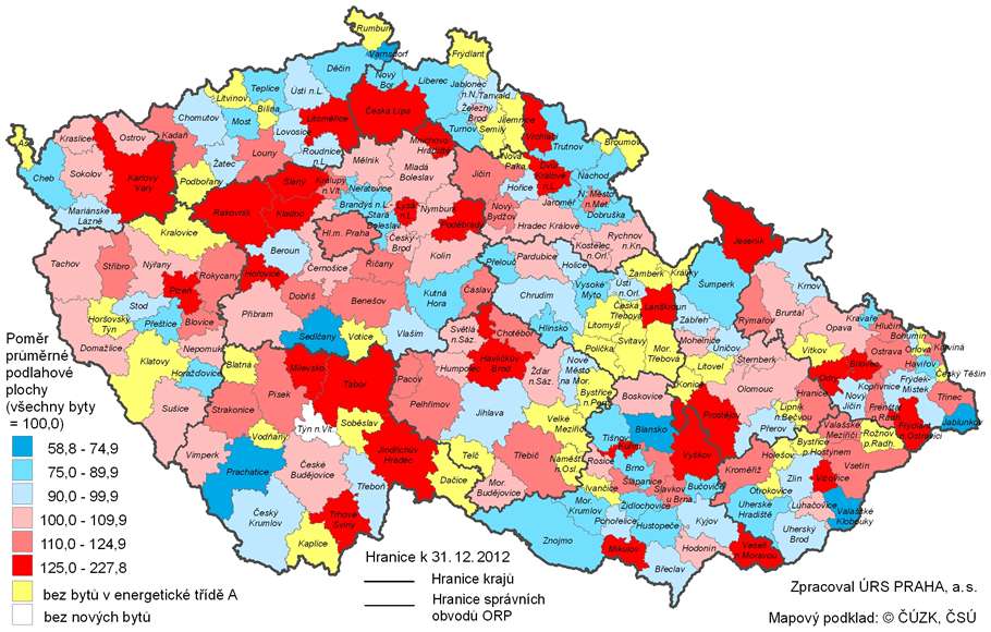 Závěrem je v grafické podobě formou kartogramu znázorněn poměr průměrné podlahové plochy bytů v rodinných domech v energetické třídě A k celkovému počtu bytů dokončených v rodinných domech v letech 2010–2011. Vzhledem k vyšším pořizovacím hodnotám v rámci třídy A by se dalo očekávat, že třída A bude dominovat především v zázemí velkých měst a v příjmově bohatších regionech.