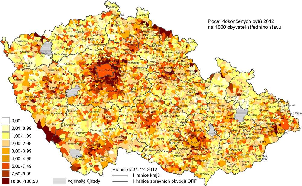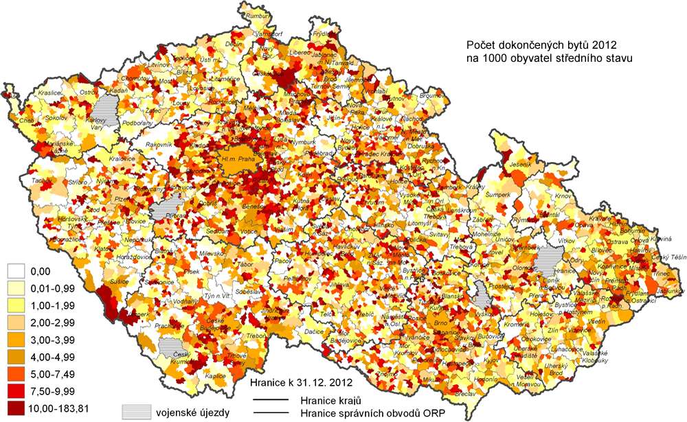 K 31. 12. 2012 existovalo na území České republiky 6251 obcí (včetně 5 vojenských újezdů). Z tohoto počtu se v období 1997–2012 podle údajů Českého statistického úřadu (ČSÚ) nepostavil ani jeden byt v 203 obcích (3,2 % z úhrnu obcí). Jinými slovy, alespoň jeden byt se postavil v 6048 obcích, tedy v 96,8 % celostátního úhrnu všech obcí. Více než 20 bytů bylo postaveno v 2720 obcích, které tvoří více než dvě pětiny (43,5 %) počtu všech obcí.