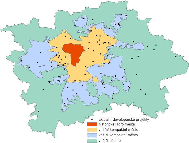 V souboru 106 identifikovaných aktuálních developerských projektů jsme nezaznamenali ani jeden projekt, který by byl lokalizovaný v pásmu historického jádra města. Důvodem jsou především absence zastavitelných ploch pro výstavbu nových domů, resp. přísná památková ochrana tohoto jedinečného území.