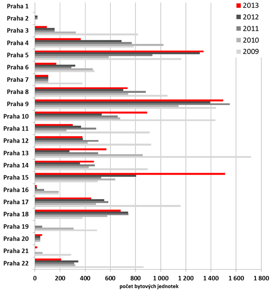 Z hlediska rozsahu nové bytové se ale oproti předchozím letům relativní intenzita výstavby v severovýchodní části Prahy poněkud snížila, a to především s ohledem na enormní nárůst nabídky nových bytů v jihovýchodní části kompaktního města, konkrétně na území správních obvodů Praha 10 a Praha 15. V těchto dvou správních obvodech bylo v rámci aktuálních developerských projektů alokováno 2406 nových bytů, což představuje téměř 100 % nárůst oproti roku 2011 a zároveň čtvrtinu ze všech bytů, které byly v září 2013 identifikovány v rámci aktuálních developerských projektů na území celé Prahy.