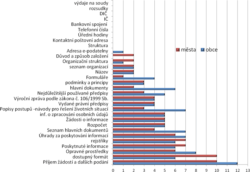 - Nejčastějšími chybami jsou stále položky „Příjem žádostí a dalších podání“ a „Opravné prostředky“. Kdysi totiž vznikl omyl, že se tyto položky mají týkat jen poskytování informací. Není to tak – vztahují se na všechny agendy, které obec řeší. A ačkoliv na to roky upozorňujeme a uvádíme příklady dobré praxe, chyba přetrvává. Velkou chybou také je publikování v testově nečitelném formátu. Četnost chyb v roce 2013 ukazuje graf.