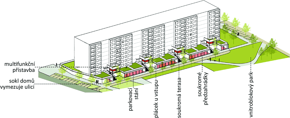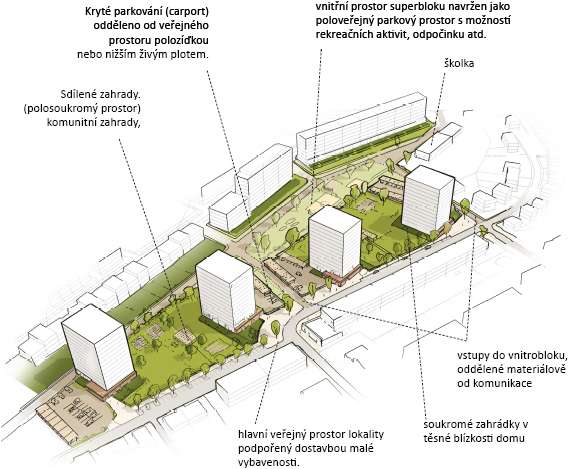 Toto členění města, známé především z jeho tradičních částí, je přitom možné relativně jednoduchými zásahy do jeho struktury docílit i v prostředí sídlišť a to ve většině případů pouhou úpravou parteru. Takové řešení může zároveň napomoci nalezení nového využití pro často předimenzovaná veřejná prostranství, přivést do nich život a rozdělit náklady na údržbu aniž by to ten, kdo novou odpovědnost přijímá, vnímal jako újmu. Současný charakter „domů v zeleni“ se přitom nemusí významně měnit, a přesto se může toto prostředí stát místem mnohem srozumitelnějším a příjemnějším.