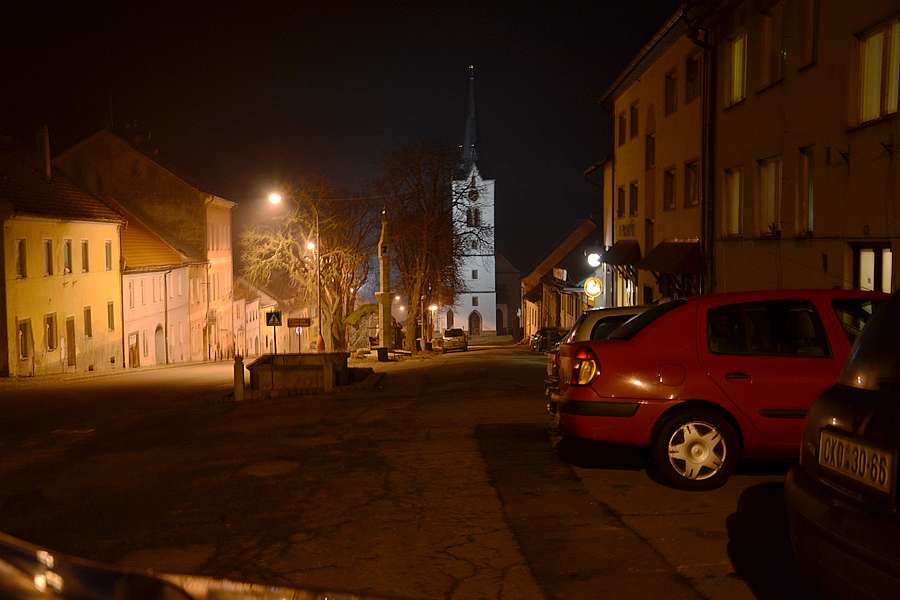 Pohledová analýza byla provedena i v intravilánu obce, kde bylo vytipováno několik pohledů na centrum obce, které mohou být v nočních hodinách výrazně ovlivněny veřejným osvětlením. Hlavní pohledová osa (A) míří ze západní části náměstí na kostel s parkovou úpravou před kostelem. Z pohledu je patrné, že stávající soustava veřejného osvětlení brání pohledu na hlavní dominantu, kostela sv. Kateřiny (obr. 1). Současné osvětlení na náměstí je nevyvážené. Zatímco fasády objektů severní části náměstí jsou osvětleny dostatečně, fasády v jižní části se ztrácí ve tmě. Kostel je i v tomto pohledu osvětlen nedostatečně.