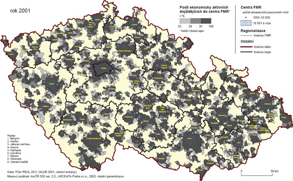 Atlas sídelního systému České republiky[2] uvádí 260 tzv. pracovních mikroregionů. Funkční městské regiony tvoří jádrové město a obce v jeho zázemí (obr. 1), které jsou k městu připoutány intenzivními každodenními vztahy. Tyto funkční městské regiony pokrývají cca 55 % území České republiky, zahrnují zhruba 60 % obcí a žije v nich téměř 83 % obyvatel. Uvedené podíly se v čase příliš nemění. Území mimo funkční městské regiony vykazuje zpravidla podprůměrné zalidnění[3].