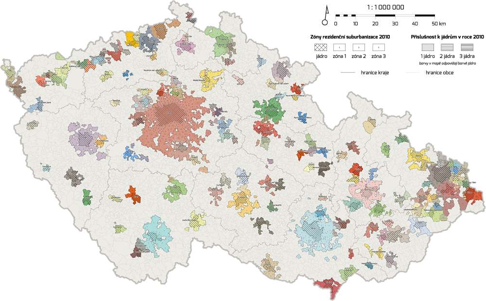 Jiný pohled na souvislosti v území a na vzájemnou závislost rozvoje jednotlivých obcí poskytuje např. Atlas obyvatelstva[4]. Mimo jiné se věnuje i rezidenční suburbanizaci, související s oddělováním bydliště a pracoviště a s vysokou preferencí bydlení v rodinném domě (obr. 2). Obce v zázemí jádrového města se tak stávají rozšířeným územím městského regionu s intenzívními sociálními vazbami a s narůstajícími dalšími formami mobility. Atlas obyvatelstva rovněž upozorňuje na to, že česká suburbanizace je velice specifická a nelze na ni šablonovitě používat zkušenosti ze s jiným historickým vývojem a sídelní strukturou.