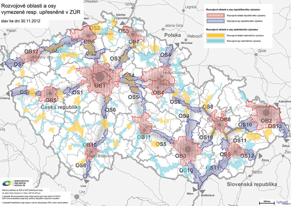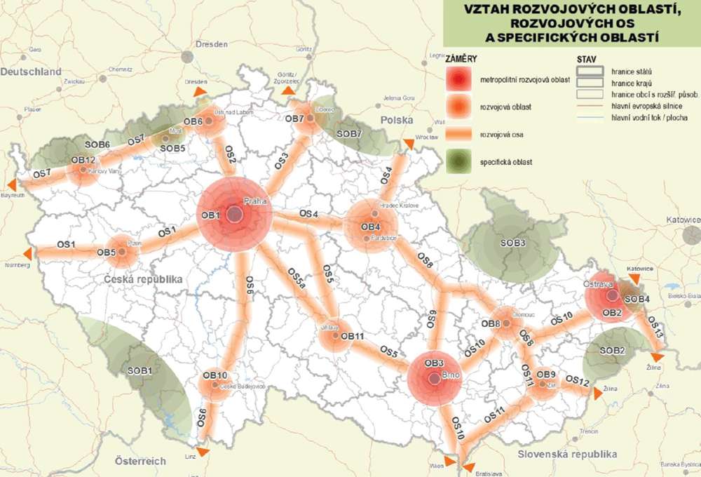 - Viz PÚR čl. (39) písm. a): „Při respektování republikových priorit územního plánování umožňovat v rozvojových oblastech a rozvojových osách intenzivní využívání území v souvislosti s rozvojem veřejné infrastruktury. Z tohoto důvodu v rozvojových oblastech a v rozvojových osách vytvářet podmínky pro umístění aktivit mezinárodního a republikového významu s požadavky na změny v území a tím přispívat k zachování charakteru území mimo rozvojové oblasti a rozvojové osy.“