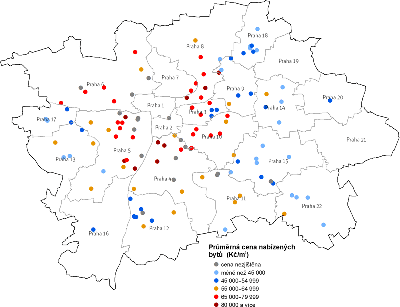 Vedle velikosti projektu je důležitým cenotvorným faktorem pochopitelně i celkový charakter a kvalita provedení rezidenčního projektu a klíčový význam má jeho lokalizace, přičemž důležitou roli sehrává nejenom kvalita lokality, ale také její poloha vůči centru Prahy. To ilustruje schéma č. 1, ze kterého je patrné, že dražší projekty (zvýrazněné odstíny červené barvy) jsou soustředěny především do částí vnitřního města obklopujícího historické centrum a zároveň, že levnější projekty (zvýrazněné odstíny modré barvy) jsou soustředěny spíše do okrajovějších částí Prahy. Z pohledu území správních obvodů lze konstatovat, že projekty nabízející v průměru nejdražší byty jsou soustředěny do Prahy 5, Prahy 6, Prahy 8, Prahy 7 a Prahy 4, kde se průměrná cenová hladina pohybovala v poměrně úzkém rozmezí od 67,7 tisíc Kč/m2 do 70,2 tisíc Kč/m2. Finančně nejdostupnější byly nové byty na území správních obvodů Praha 22, Praha 15 a Praha 17, kde jsou v průměru nabízeny za méně než 45 tisíc Kč/m2.