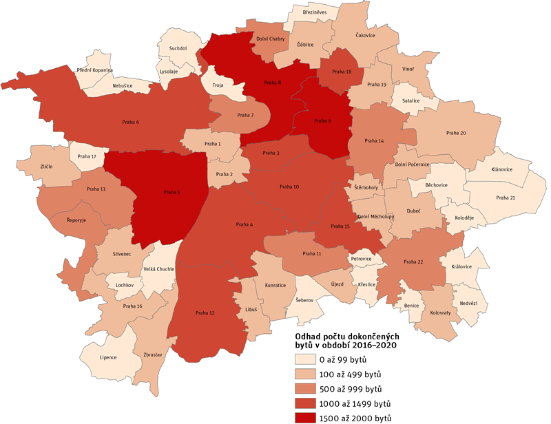 V rámci jednotlivých městských částí existují přirozeně značné rozdíly v rozsahu stávající i odhadované bytové výstavby. Na základě provedeného odhadu bude v období 2016–2020 bytová výstavba nejrozsáhlejší v městských částech Praha 5, Praha 8 a Praha 9. V každé z těchto městských částí by mělo během příštích pěti let dokončeno minimálně 1500 nových bytů. Výstavba více než 1000 bytů by měla být realizována rovněž na území městských částí Praha 3, Praha 4, Praha 6, Praha 10, Praha 12, Praha 15 a Praha 18 (viz schéma č. 2).