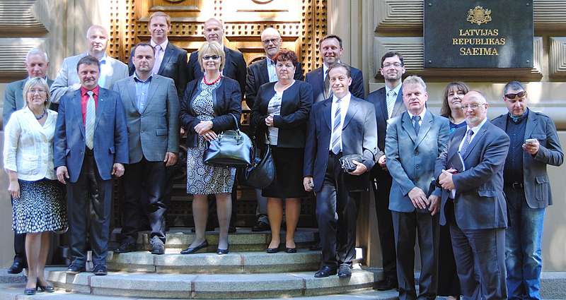 Pracovní skupina tajemníků na studijním pobytu u partnerské organizace výkonných ředitelů (vedoucích úřadů) LPIA v Lotyšsku, před budovou Parlamentu