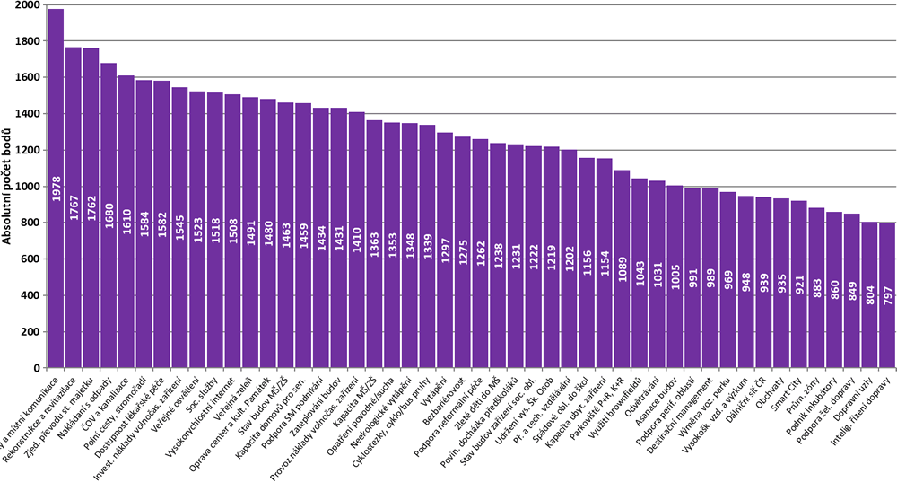 Pokud bychom provedli rozdělení potřeb obcí a měst podle hodnocení ve velikostních kategorií (do 2000, 2001–10 000, 10 001–50 000, nad 50 000 obyvatel), potom jsou relativně obdobné výsledky u prvních tří kategorií obcí a měst, kde na prvním místě jsou vždy právě „chodníky a místní komunikace“. „Zjednodušení převodu majetku“ je u nejmenších obcí na druhém místě, „rekonstrukce a revitalizace“ je zde na místě třetím. Následuje „nakládání s odpady“, „stav čističek odpadních vod a kanalizace“. Na posledních místech u nejmenších obcí je „podpora železniční dopravy“, „dopravní uzly“ a „inteligentní řízení dopravy“. Druhá velikostní kategorie obcí preferuje na druhém místě „rekonstrukce a revitalizace,“ třetí je „nakládání s odpady“. Obdobně obce od 2001 do 10 000 obyvatel nejméně zajímají „dopravní uzly“ a „inteligentní řízení dopravy, navíc také „podnikatelské inkubátory.“ Ve třetí velikostní kategorii měst jsou na druhém místě potřeb „cyklostezky a vyhrazené pruhy pro cyklisty,“ na třetím místě je „revitalizace památek.“ Na posledních místech v řešení potřeb těchto měst jsou „spádové oblasti škol“, „podpora železniční dopravy“ a „povinná docházka předškoláků.“ Největší města preferují řešit potřeby v oblasti „vysokoškolského vzdělávání,“ druhé je „neekologické vytápění“ a následuje „revitalizace památek.“ Na posledních místech potřeb těchto měst je „kapacita MŠ a ZŠ“ a „spádové oblasti škol.“