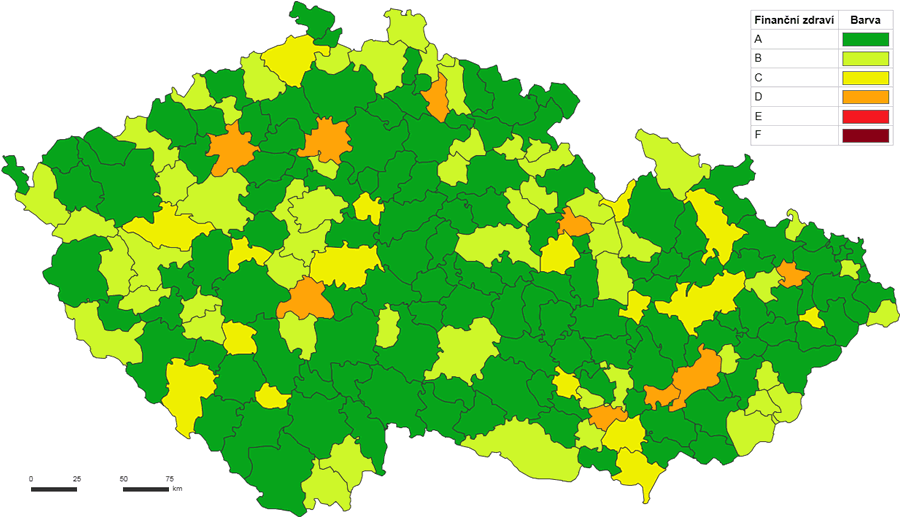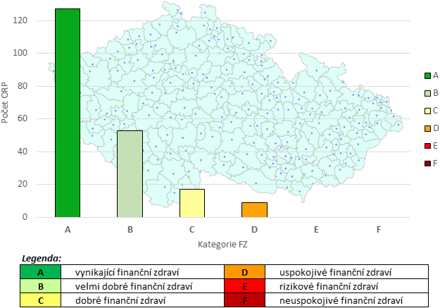 Výsledný kartogram 1 popisuje finanční zdraví všech 206 obcí s rozšířenou působností, ve kterých žije 6 milionů obyvatel. Výsledek analýzy poukazuje na dobré finanční zdraví všech měst s rozšířenou působností. Finanční zdraví téměř 62 % hodnocených obcí dosahuje nejvyšší bonity. Vynikající finanční zdraví v roce 2017 mělo 127 hodnocených měst. Kategorie B, velmi dobré finanční zdraví, pak dosáhlo dalších 25 % obcí (53 měst). Dobrého finančního zdraví – kategorie C, dosahovalo 8,25 % obcí (17 měst). I několik málo obcí s kategorií D vykazuje finanční zdraví uspokojivé např. ve vztahu k poskytování dotací. Rizikové úrovně E nedosahuje žádná obec s rozšířenou působností, stejně tak žádná obec nemá hodnocení v neuspokojivé kategorii D (viz kartogram 2).
