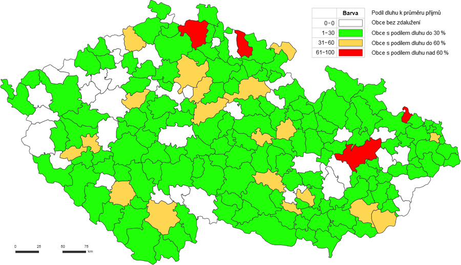 Naopak 39 měst s rozšířenou působností je zcela bez jakéhokoliv dluhu, 28 měst má dluh nepřevyšující 5 % průměrného příjmu, dalších 31 měst 10 %, 34 měst do 15 % a 51 měst do 30 %. Zadlužení pouze 16 obcí převyšuje 50 % průměrných příjmů. Nad hranicí sledovaných 60 % se pohybují pouze 4 města, z nichž však všechna dostávají svým závazkům včas a stát nemusí fiskální pravidlo aplikovat (tabulka 2).