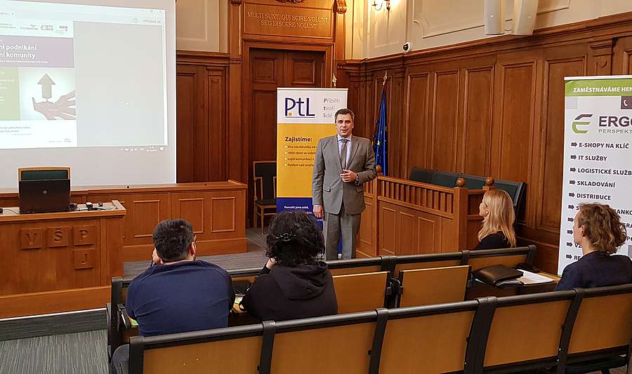 PhDr. Ing. Vít Skála, Ph.D., majitel sociálního podniku PTL, s. r. o., jeden z organizátorů konference, představil praktické aspekty sociálního podnikání.