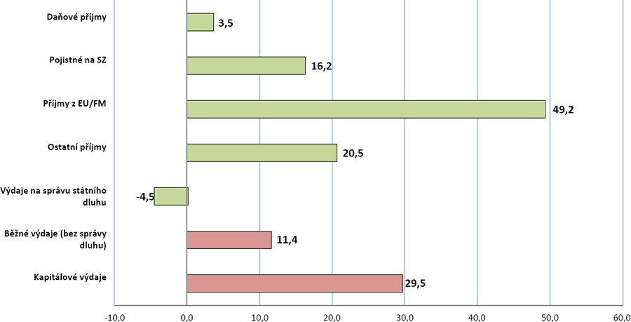 Celkové příjmy státního rozpočtu meziročně výrazně vzrostly o 130,3 mld. Kč, tj. o 10,2 %. Napomohly tomu všechny hlavní složky příjmů – daňové příjmy s růstem o 36,5 mld. Kč, tj. o 5,3 %, pojistné na sociální zabezpečení s růstem o 46,9 mld. Kč, tj. o 10,0 % i ostatní příjmy tažené zejména růstem prostředků přijatých z rozpočtu EU a FM.