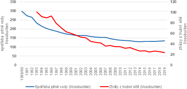 Tento poměr se historicky výrazně vyvíjel do současného stavu, neboť zásobování ze zdrojů podzemní vody nahradily odběry povrchové vody z vybudovaných 47 vodárenských nádrží. Uvedené využívání zdrojů pitné vody bylo, až donedávna, naprosto dostatečné k bezproblémovému pokrytí spotřeby. Přispěl k tomu výraznou měrou jak pokles spotřeby vodovodní vody, tak průběžné snižování ztrát vody z trubního systému veřejných vodovodů (obrázek 4).