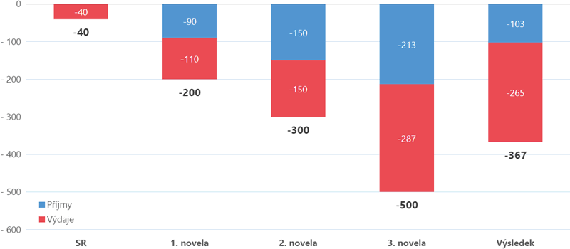 Rozpočtované saldo státního rozpočtu se v průběhu roku třikrát zvyšovalo z původních 40 mld. Kč postupně na 200, 300 a na konečných 500 mld. Kč. Plán versus skutečnost je nejlépe vidět na grafu 1.
