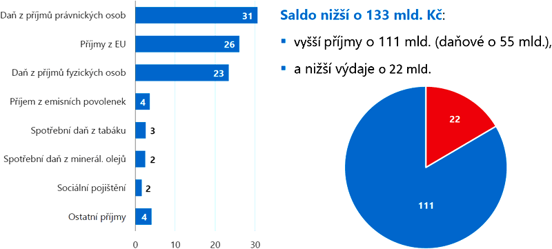 Za nižším, než plánovaným schodkem stály především příjmy, které o 110,7 mld. Kč převýšily rozpočtovanou úroveň. Podílely se na tom z poloviny daňové příjmy (+55,1 mld. Kč), příjmy z Evropské unie a finančních mechanismů (+26,0 mld. Kč), tak i ostatní příjmy (+29,6 mld. Kč). Nicméně oproti původnímu rozpočtu schválenému v roce 2019 se příjmy z daní a pojistného propadly o téměř 150 mld. Kč. Celkové výdaje nebyly oproti rozpočtované výši realizovány o 21,9 mld. Kč, přičemž kapitálové pouze o 1,7 mld. Kč (graf 4).