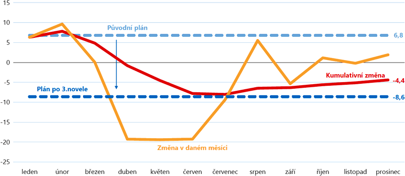 Pozitivní vývoj hospodaření rozpočtu v prvních dvou měsících roku, kdy inkaso daní a pojistného převyšovalo předpoklady a pokrývalo tempo růstu běžných výdajů, byl ve zbývající části roku oslaben snahou čelit epidemii nemoci COVID-19, způsobené novým koronavirem SARS-CoV-2. Opatření přijatá na zmírnění jejích dopadů vedla ve svých důsledcích k výrazným propadům především daňových příjmů (graf 2) a k nárůstům výdajů zaměřených na pomoc jednotlivcům, firmám i dalším částem veřejných rozpočtů (graf 3).